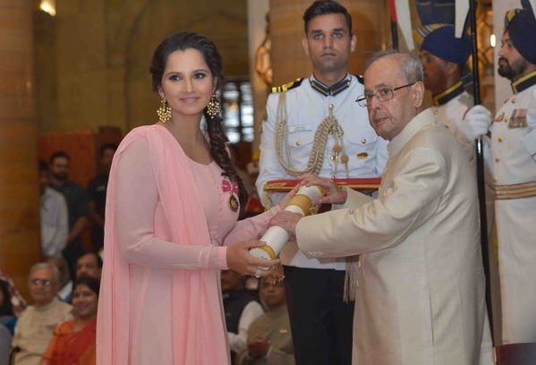 Tennis star Sania Mirza was honoured with the Padma Bhushan award at the Rashtrapati Bhavan by the President of India Pranab Mukherjee on Tuesday. The 29-year-old, who is currently ranked No.1 in the world in women's doubles, took to social media to express her delight at receiving this honour.