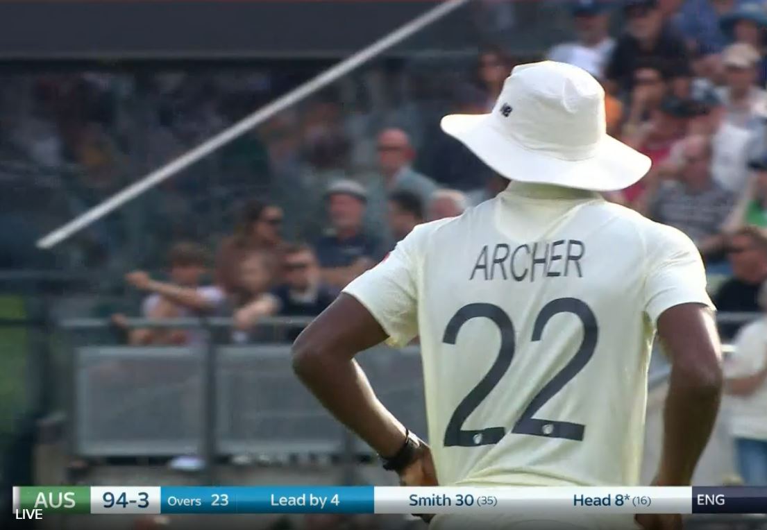 Archer's first wicket was – reminiscent of many of his previous 131 first-class wickets – a ball cutting into the right-handed Cameron Bancroft off the pitch and threatening his stumps. Umpire Aleem Dar showed no hesitation in raising his finger, and a review showed that the balls were clipping the top of middle.