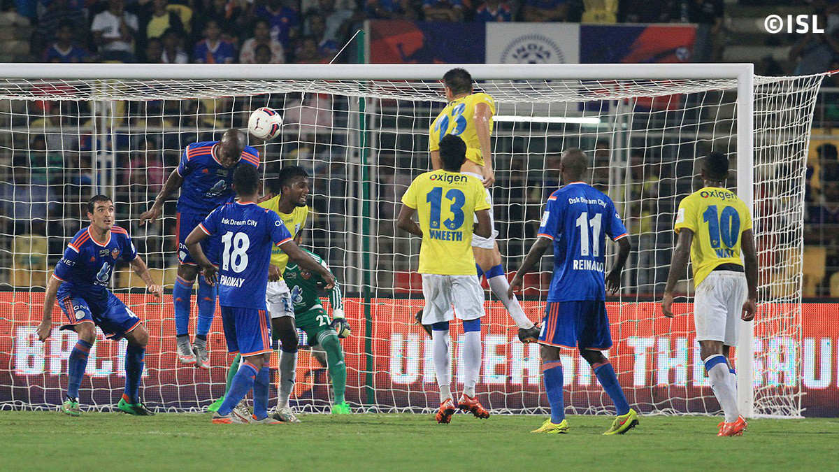 Goa were failing to create any significant openings in this game, but Leo Moura scored the equalizer against the run of play with a moment of magic. In the 45th minute, Kerala goalkeeper Stephen Bywater failed to collect a corner and only managed to punch it towards Moura at the edge of the penalty box. The Brazilian controlled the ball delightfully with his first touch, and then volleyed it past the hapless custodian into the top corner.