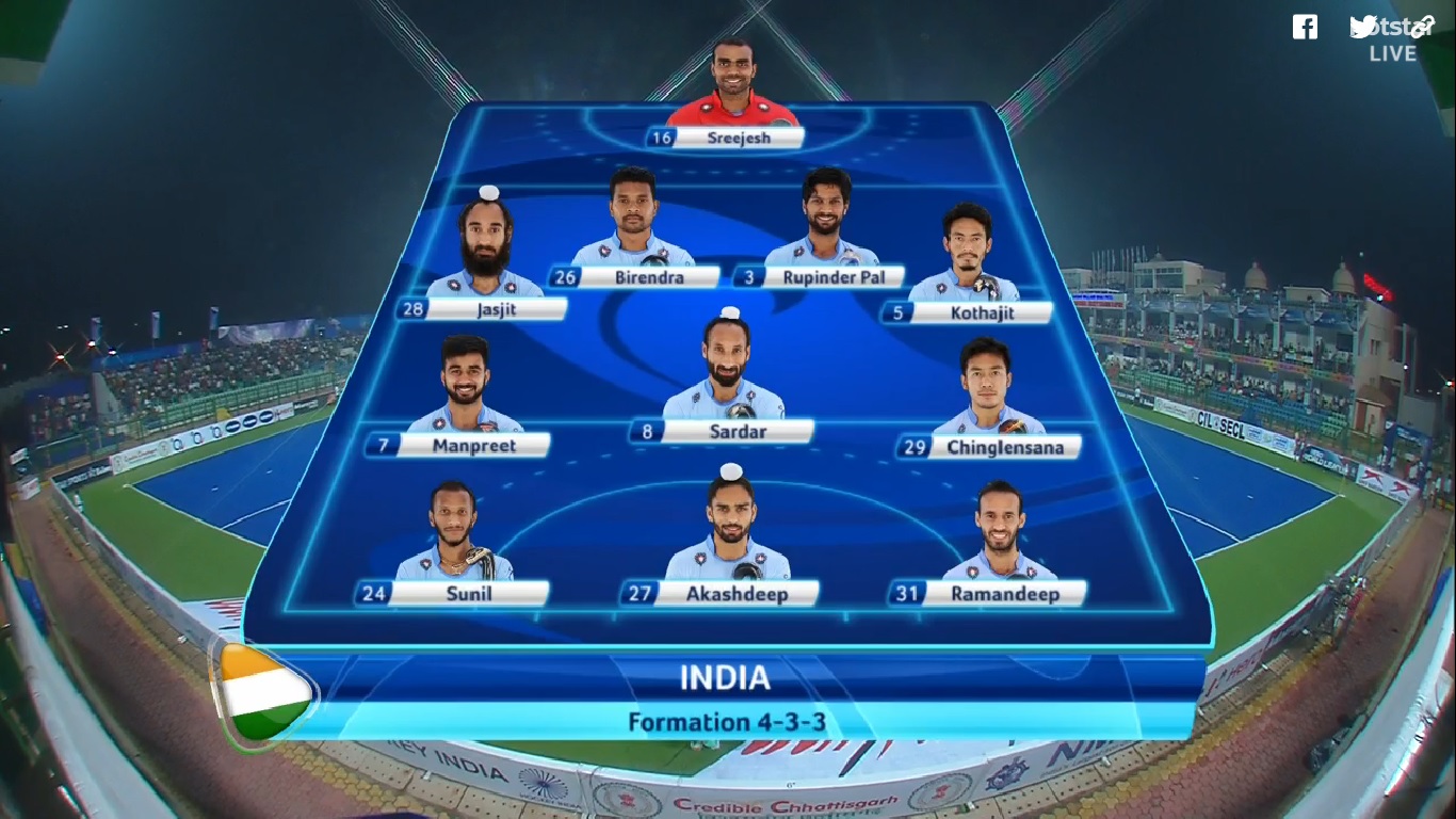 The head to head record between the teams was in favour of Netherlands, with only one win for the hosts in the last eighteen years – which came during the last meeting between the two teams in the Champions Trophy last year. The hosts downed the World No.2 side 3-2 at Bhubaneswar in a close match in the pool stages. Roelant Oltmans continued the 4-3-3 formation he used against Germany with SV Sunil coming for Amir Khan. VR Raghunath who was playing his 200th International match started on the bench.