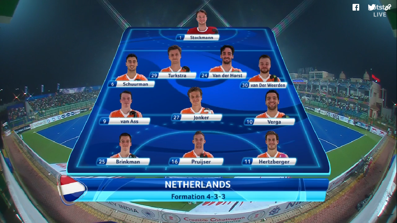 On the other hand, Netherlands were the table toppers going into the match against India with four points from two games. After a scoreless draw in the first match against Germany, Netherlands notched up a 3-2 victory in a close encounter against Argentina. Netherlands started in a 4-3-3 formation as well, with Jaap Stockmann in goal and captain Robert Van Der Horst and penalty corner expert Mink Van Der Weerden starting in defence.